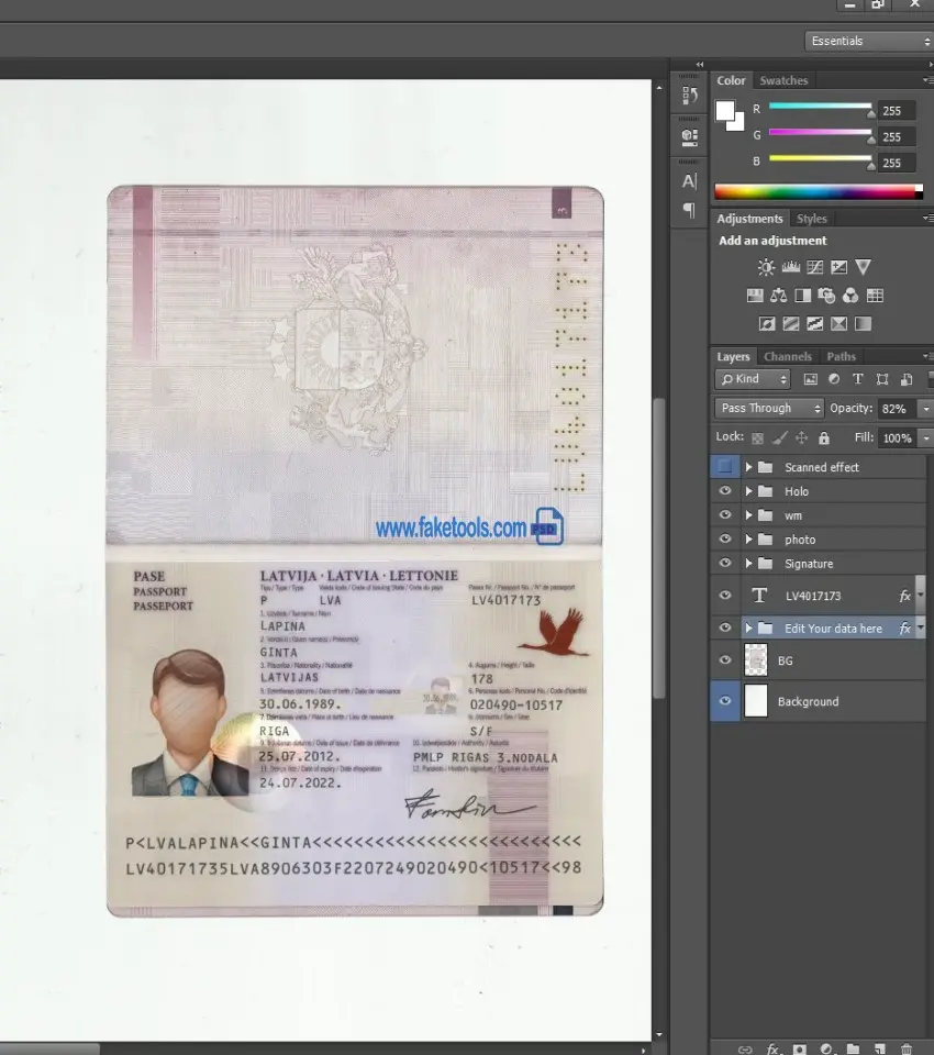 Sometimes, you need to upload a copy of your passport for verification on your online platform. The website may ask you to upload a photo of your passport to confirm your identity. It’s a very easy task, but the problem comes when you lose your real passport or the account is not in your name, perhaps. Our Psd template solves the problem. The Latvia passport template PSD is a layer-based Photoshop file. Fully editable PSD template. Providing a high-quality PSD template for creating a realistic document. Each layer is individual and editable. This ensures the template allows for easy customization of personal information. You can click on each layer and change it, including the photo, name, passport number, issue date, expiration date, gender, birth date, background, and more. That’s what makes it useful.