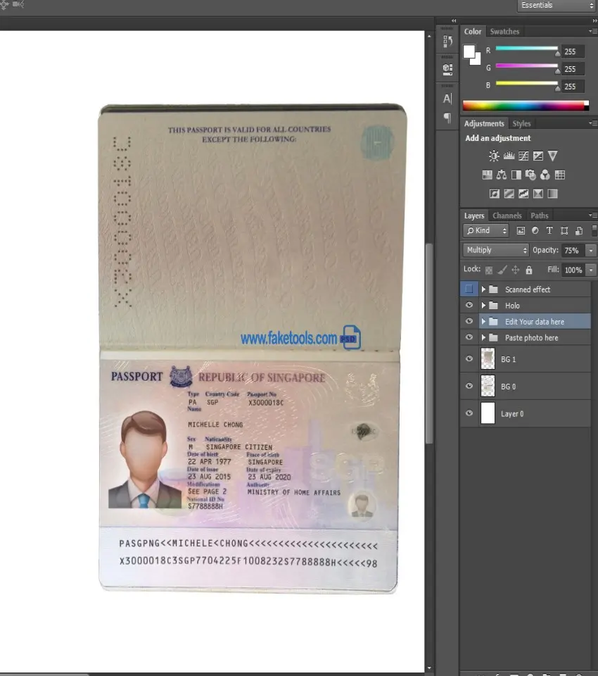 Sometimes, you need to upload a copy of your passport for verification on your online platform. The website may ask you to upload a photo of your passport to confirm your identity. It’s a very easy  task, but the problem comes when you lose your real passport or the account is not in your name, perhaps. Our Psd template solves the problem. The Singapore passport template PSD is a layer-based Photoshop file. Fully editable PSD template. Providing a high-quality PSD template for creating a realistic document. Each layer is individual and editable. This ensures the template allows for easy customization of personal information. You can click on each layer and change it, including the photo, name, passport number, issue date, expiration date, gender, birth date, background, and more. That’s what makes it useful.