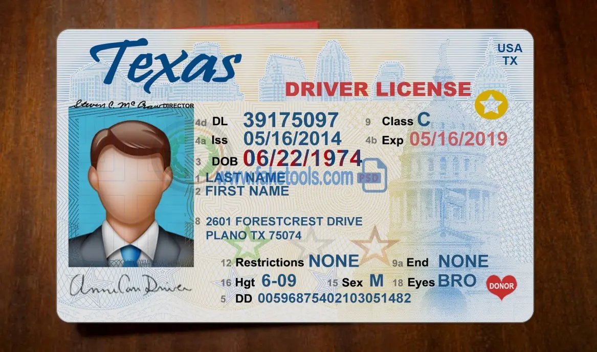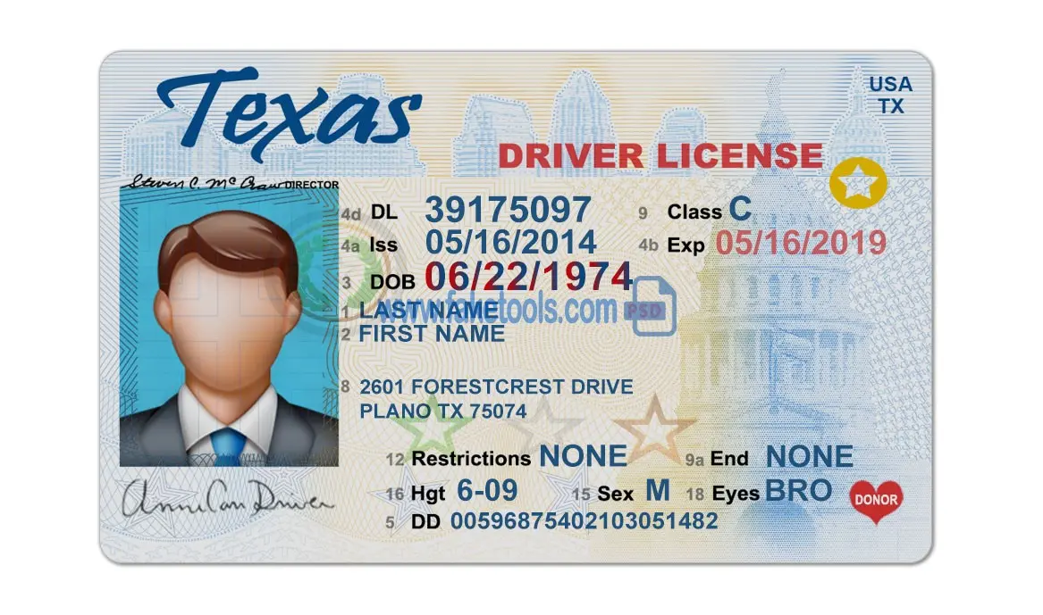 The Texas Drivers License template PSD is a layer-based Photoshop file. Fully editable PSD template. Providing a high-quality PSD template for creating a realistic document. Each layer is individual and editable. This ensures the template allows for easy customization of personal information. You can click on each layer and change it, including the photo, name, DL number, issue date, expiration date, gender, birth date, background, and more. That’s what makes it useful.