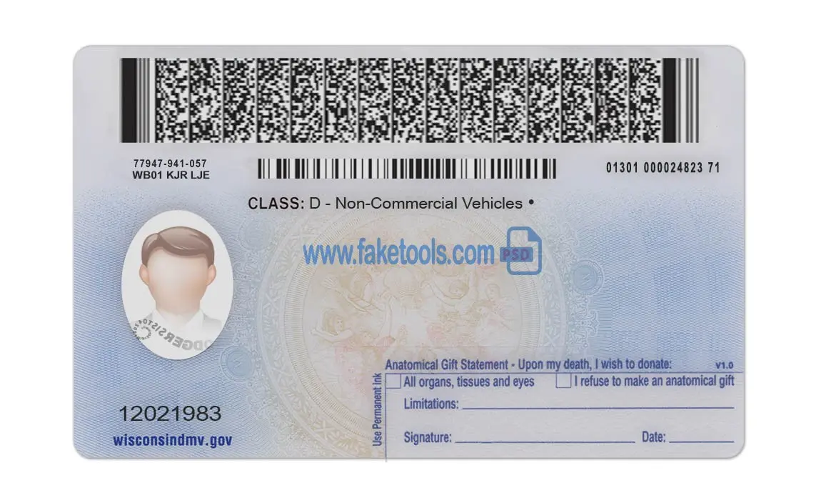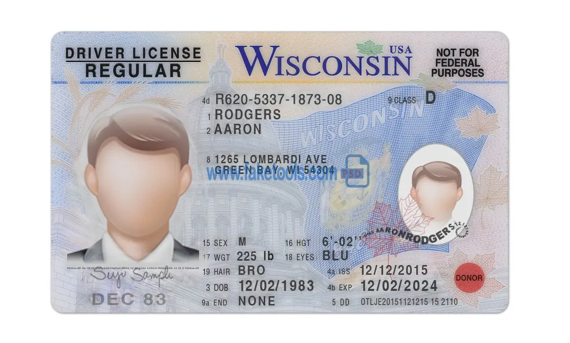 The Wisconsin Drivers License template PSD is a layer-based Photoshop file. Fully editable PSD template. Providing a high-quality PSD template for creating a realistic document. Each layer is individual and editable. This ensures the template allows for easy customization of personal information. You can click on each layer and change it, including the photo, name, DL number, issue date, expiration date, gender, birth date, background, and more. That’s what makes it useful.